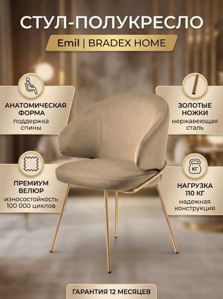 Стул-полукресло BRADEX HOME Emil бежевый с золотыми ножками - ОписаниеПолукресло Emil имеет широкую изогнутую спинку и мягкое сиденье, которые обеспечивают максимальный уровень комфорта. Ножки выполнены из полированной нержавеющей стали, они не подвержены коррозии и при правильном уходе сохранят свой первоначальный вид 50 лет. Все видимые сварочные швы на ножках тщательно отполированы. Напыление нитрид титана, обеспечивает ножкам натуральный цвет золота. Велюровая обивка обеспечивает невероятную мягкость и красивый глубокий цвет, износостойкость 100 000 циклов.