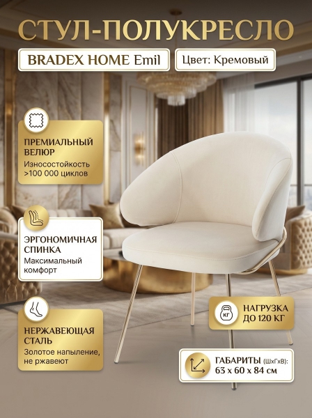 Стул-полукресло BRADEX HOME Emil - ОписаниеПолукресло Emil имеет широкую изогнутую спинку и мягкое сиденье, которые обеспечивают максимальный уровень комфорта. Ножки выполнены из полированной нержавеющей стали, они не подвержены коррозии и при правильном уходе сохранят свой первоначальный вид 50 лет. Все видимые сварочные швы на ножках тщательно отполированы. Напыление нитрид титана, обеспечивает ножкам натуральный цвет золота. Велюровая обивка обеспечивает невероятную мягкость и красивый глубокий цвет, износостойкость 100 000 циклов.