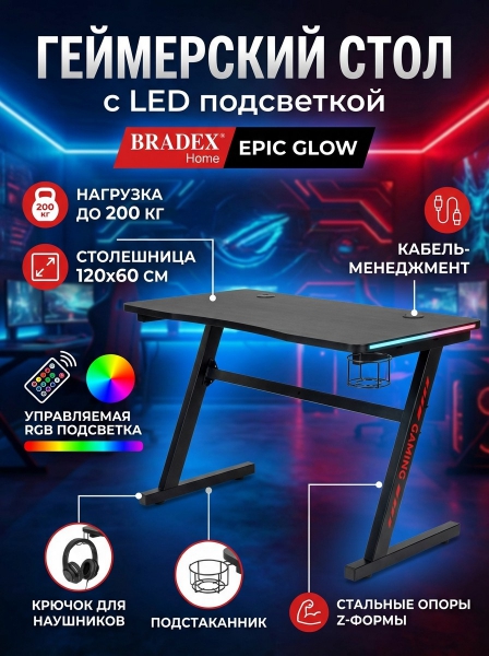 Геймерский стол с LED подсветкой Bradex Home Epic glow - БрендСтрана бренда: Россия Премиальность бренда:Посмотреть все геймерские компьютерные столы Bradex Home (2) Геймерский стол с LED подсветкой Bradex Home Epic glow - Характеристики