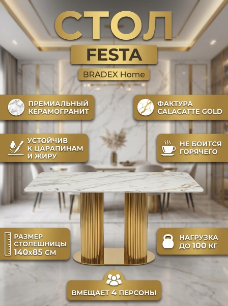 Стол BRADEX HOME Festa, керамогранит Calacatte gold (глянец), золото