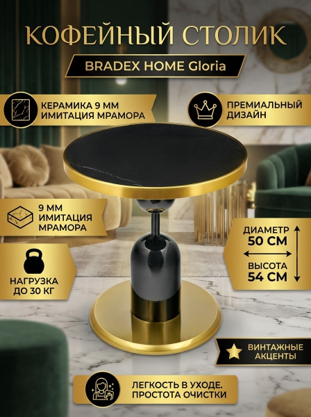 Кофейный столик BRADEX HOME Gloria диам.50см x 54см, чёрный, металл, керамика - ОписаниеЖурнальный столик Gloria — это настоящая изюминка для любого интерьера. Его элегантный дизайн и уникальная форма привлекут восхищенные взгляды ваших гостей, добавляя нотку роскоши в ваш дом. Изготовленный из высококачественных материалов, столик Gloria гарантирует надежность и долговечность. Оригинальное сочетание основания из керамогранита с имитацией черного мрамора и стильной металлической ножки черного цвета выделяет его среди других предметов мебели, подчеркивая его исключительность. Изящное золотое обрамление по краю основания и золотое металлическое основание под ножкой придают столику винтажный вид, делая его идеальным выбором для тех, кто ценит стиль и элегантность. Круглая форма и компактные размеры делают его универсальным, позволяя использовать столик не только в качестве журнального, но и в качестве прикроватной тумбы или дополнительной подставки в любом уголке вашего дома. Благодаря своей универсальности и легкости, столик Gloria станет отличным дополнением как для небольших, так и для просторных помещений, гармонично вписываясь в любой интерьер и подчеркивая ваш индивидуальный стиль.