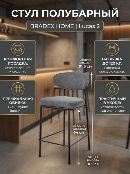 Стул полубарный BRADEX HOME Lucas 2 серый шенилл с чёрными ножками - ОписаниеДизайнерский полубарный стул Lucas 2 — это изысканный акцент, который придаст вашему дому, офису или ресторану атмосферу современности и уюта. Сиденье и спинка стула выполнены из роскошной ткани букле, обладающей не только приятной на ощупь текстурой, но и высокой стойкостью к износу. Рельефная поверхность добавляет интерьеру натуральности, подчеркивает контуры стула и сглаживает жесткие формы, создавая гармонию в пространстве. Мелкозернистая фактура букле формирует теплую и спокойную атмосферу, приглашающую к отдыху. Стул способен выдерживать нагрузку до 120 кг, что подчеркивает его долговечность и надежность в использовании. Мягкие и широкие спинка и сиденье обеспечивают максимальный комфорт, позволяя вам наслаждаться любой работой или мгновением отдыха.