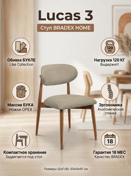 Стул BRADEX HOME Lucas 3 латте букле с ножками цвета орех - ОписаниеСтул Lucas 3 — это стильное и функциональное решение для вашего дома, офиса или ресторана. Его сиденье и спинка изготовлены из высококачественной ткани букле коллекции Like, которая приятна на ощупь и устойчива к износу. Благодаря трикотажной подложке, ткань сохраняет свою форму и легко драпируется. Рельеф поверхности ткани добавляет пространству природной текстуры, выделяет очертания мягкой мебели и сглаживает угловатость её форм. Мелкозернистая фактура букле создаёт тёплую и спокойную атмосферу в интерьере. Плавные линии, мягкие контуры и современный дизайн стула Lucas 3 позволяют ему легко вписаться в различные стилистические решения, такие как классический, минималистичный, скандинавский, джапанди, японский или ваби-саби. Мягкие спинка и сиденье обеспечивают максимальный комфорт. Оригинальный каркас стула изготовлен из массива натурального дерева бук в благородном ореховом цвете. Прочные и надёжные ножки стула гарантируют устойчивость и долговечность. Выпирающие части каркаса минимальны, что делает стул удобным для использования в ограниченном пространстве. Мелкая структура дерева образует удивительно гладкую поверхность, придающую стулу особый шарм.