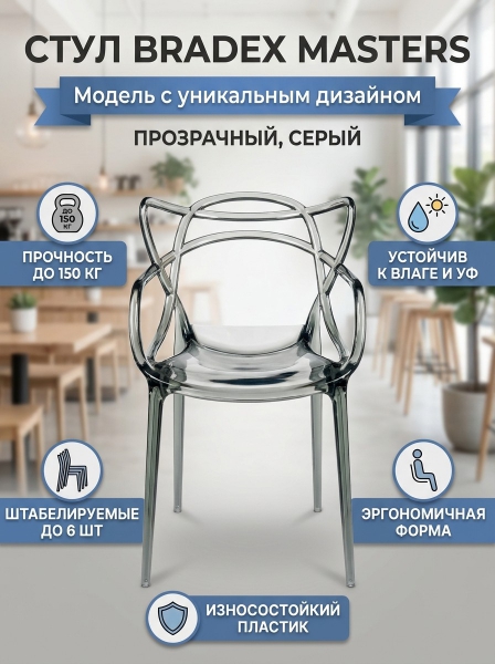 Стул BRADEX HOME Masters - ОписаниеСтул Masters прозрачный - одно из самых удивительных и привлекательных решений дизайна пластиковых стульев. Уникальное сочетание тонких линий элементов спинки, подлокотников и ножек, предоставляет возможность универсального решения для жилых помещений, современных офисных пространств, баров, кафе, ресторанов и отелей. Варианты матовых отделок и металлизированного эффекта пластика расширяют возможность реализаций со стульями Masters в разных по стилю и дизайну помещениях.