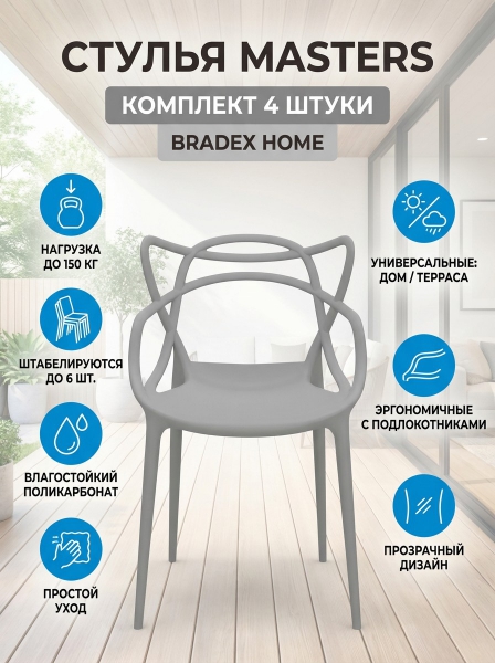 Комплект из 4-х стульев BRADEX HOME Masters прозрачный - ОписаниеСтул Masters прозрачный - одно из самых удивительных и привлекательных решений дизайна пластиковых стульев. Уникальное сочетание тонких линий элементов спинки, подлокотников и ножек, предоставляет возможность универсального решения для жилых помещений, современных офисных пространств, баров, кафе, ресторанов и отелей. Варианты матовых отделок и металлизированного эффекта пластика расширяют возможность реализаций со стульями Masters в разных по стилю и дизайну помещениях.