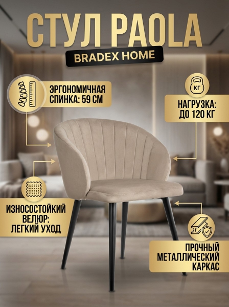 Стул Bradex Home Paola - ОписаниеСтулья Paola на устойчивом металлическом каркасе отличаются прочностью и надежностью. Широкая мягкая спинка обеспечит позвоночнику отличную опору в течение длительного времени. Благодаря своему внешнему виду он отлично впишется в любой современный интерьер.