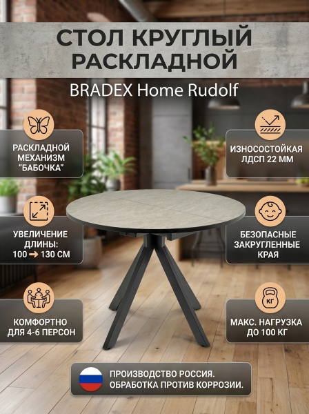 Стол круглый раскладной Bradex Home Rudolf 100-130 см - БрендСтрана бренда: Россия Премиальность бренда:Стол круглый раскладной Bradex Home Rudolf 100-130 см - Характеристики
