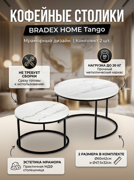 Набор кофейных столиков BRADEX HOME Tango белый мрамор с чёрными ножками - ДоставкаДоставка по Санкт-Петербургу: бесплатно, 2-3 дня Доставка по России: стоимость уточняйте у оператора. Набор кофейных столиков BRADEX HOME Tango белый мрамор с чёрными ножками - Отзывы0.0