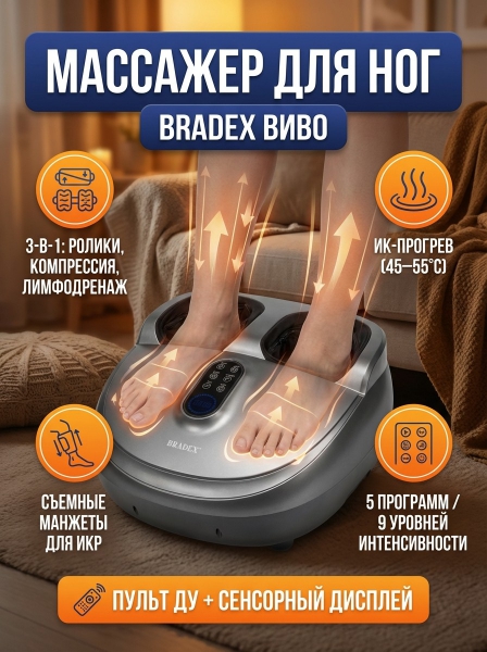 Массажер для ног Bradex Виво - ОписаниеСомневаетесь? - Посмотрите рейтинг ТОП-10 по категории «Массажеры»Массажер для ног ВИВО со съемными лимфодренажными манжетами – ваш профессиональный массажист на дому. Это устройство идеально совмещает в себе три типа воздействия: традиционный лимфодренажный массаж, с точечной проработкой акупунктурных зон стопы и интенсивный аэрокомпрессионный массаж икр. Лимфодренажный массаж – помогает улучшить циркуляцию лимфы. Лимфатическая система играет важную роль в поддержании здоровья и благополучия организма. Прессотерапия — использует давление воздуха для стимуляции кровообращения и уменьшения отеков. Прессотерапия может быть полезна для людей, страдающих от варикозного расширения вен, отеков и других проблем с кровообращением. Массажер для ног может быть рекомендован людям, которые испытывают боли в ногах, усталость и дискомфорт в области стоп и икр. Также он может быть полезен для людей, ведущих сидячий образ жизни или страдающих от избыточного веса. Эффект от использования массажера для ног может включать улучшение кровообращения, уменьшение отеков, повышение тонуса мышц и кожи, а также улучшение общего самочувствия. Однако, перед использованием массажера необходимо проконсультироваться с врачом и убедиться в отсутствии противопоказаний. Комплексное воздействие функций массажера благотворно влияет на укрепление стенок сосудов и снятию отечности. Регулярное использование устройства поможет нормализовать сон и повысить иммунную сопротивляемость организма. В комплект с массажером входят съемные лимфодренажные манжеты для зоны голени. Благодаря использованию этих манжет усиливается кровоток и противоотечный эффект. Манжеты легко снимаются и могут использоваться по необходимости. Массажер работает в автоматических режимах и режиме ручной настройки. Кроме того, можно выбрать интенсивность вращения массажных роликов. Благодаря компактному размеру, массажер легко переносится в любое удобное место в доме. Наличие пульта управления делает использование массажера еще более удобным, особенно для пожилых людей и людей с ограниченными физическими возможностями. Этот массажер - идеальное решение для тех, кто заботится о своем здоровье и хочет поддерживать свои ноги в отличной форме. Бережно прорабатывая акупунктурные точки на стопе, он помогает снизить уровень стресса в организме, улучшить качество сна и обеспечить общий оздоравливающий эффект для всего тела. Использование массажера на постоянной основе поможет предотвратить варикозное расширение вен и плоскостопие.