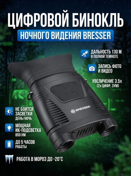 Бинокль ночного видения цифровой Bresser 3,5х с функцией записи - ОписаниеБинокль ночного видения Bresser с цифровым преобразователем имеет значительное преимущество перед ПНВ предыдущих поколений – он не боится случайной засветки. Этот прибор можно включить днем или навести ночью на яркий источник света – с ним ничего не случится. Благодаря этому бинокль сможет служить вам дольше, помогая в хобби или работе.