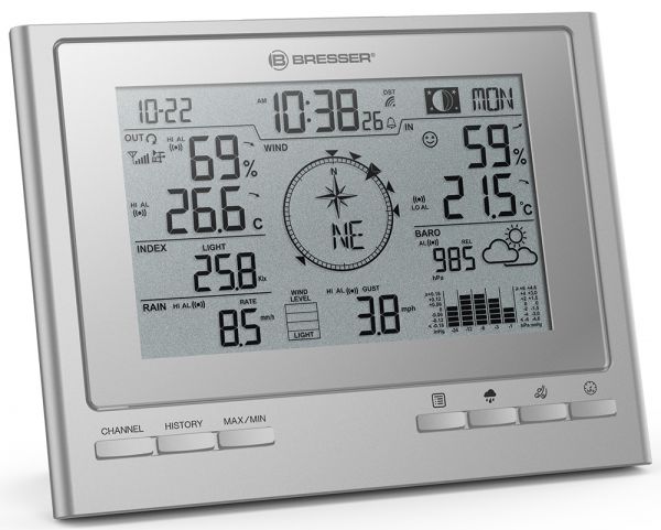 Метеостанция Bresser «7 в 1» ClimateScout Exclusive серебристая - ОписаниеПрофессиональная метеостанция Bresser «7 в 1» ClimateScout Exclusive, возможности которой понравятся требовательным пользователям. Она предоставляет максимально полный отчет о погоде за окном, позволяет следить за микроклиматом квартиры, сохраняет данные за 24 часа, составляет прогноз погоды и многое другое. Помимо стандартного набора из часов, термометра и гигрометра здесь есть барометр, дождемер и ветромер. Также прибор определяет УФ-индекс, уровень освещенности, температуру «feels like», точку росы и проч.