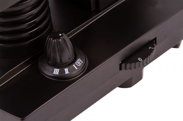 Оптическая система прибора состоит из монокулярной насадки и револьверного устройства на три объектива. Окуляров в комплекте два (10-кратный и 16-кратный), также есть линза Барлоу 2х, поэтому выбор увеличений достаточно широк. Общая кратность микроскопа находится в диапазоне от 40х до 1280х. Система освещения представлена двумя светодиодами с регулировкой яркости: один расположен над предметным столиком, второй – под ним. Регулировать световой поток можно и при помощи диска с диафрагмами и светофильтрами.