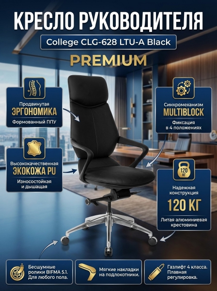 Кресло College CLG-628 LTU-A Black - ОписаниеСомневаетесь? - Посмотрите рейтинг ТОП-10 по категории «Ортопедические кресла»Кресло College CLG-628 LTU-A Black - это кресло руководителя премиум класса ультрасовременного дизайна. Высококачественная экокожа, подлокотники c накладками, крестовина - литой алюминий, механизм наклона кресла с фиксацией в 4-х положениях и регулировкой под вес сидящего, наполнитель кресла формованный ППУ. Кресло руководителя College CLG-628 LTU-A Black - это кресло для тех, кто неравнодушен к новым веяниям в дизайне офисной мебели.