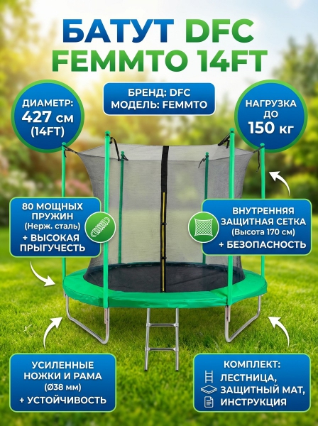 Батут с внутренней защитной сеткой DFC 14FT green - ОписаниеСомневаетесь? - Посмотрите рейтинг ТОП-10 по категории «Детские батуты»Батут с внутренней сеткой DFC Femmto 14FT зелёного цвета - отличный выбор для активного отдыха на свежем воздухе! Максимальный вес пользователя - 150 килограмм, что позволяет использовать батут как взрослым, так и детям. Цвет батута - зелёный, что делает его не только функциональным, но и стильным элементом ландшафтного дизайна.