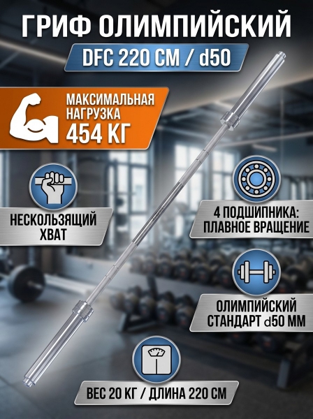 Гриф прямой DFC 220 см д50 - БрендDFC – бренд, поставляющий на рынок специализированные приборы и оборудование для красоты и здоровья.