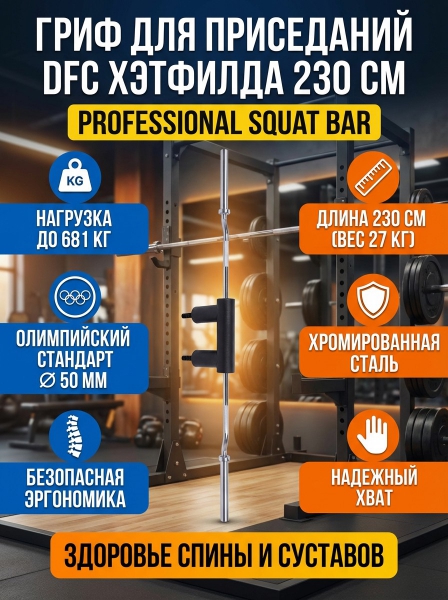 Гриф для приседаний DFC 230 см д50 - ОписаниеСомневаетесь? - Посмотрите рейтинг ТОП-10 по категории «Грифы для штанги»Гриф для приседаний 230 см DFC NTHZ-230SQ - отличный выбор для спортсменов!