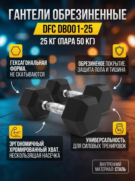 Гантели обрезиненные (пара) DFC DB001-25 - ОписаниеСомневаетесь? - Посмотрите рейтинг ТОП-10 по категории «Гантели»Гантель обрезиненная DB001-25 с хромированной ручкой. Вес гантели 25 кг, в комплекте 2 штуки (пара).