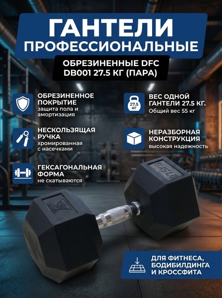 Гантели обрезиненные (пара) DFC DB001-27.5 - ОписаниеСомневаетесь? - Посмотрите рейтинг ТОП-10 по категории «Гантели»Гантель обрезиненная DB001-27.5 с хромированной ручкой. Вес гантели 27.5 кг, в комплекте 2 штуки (пара).