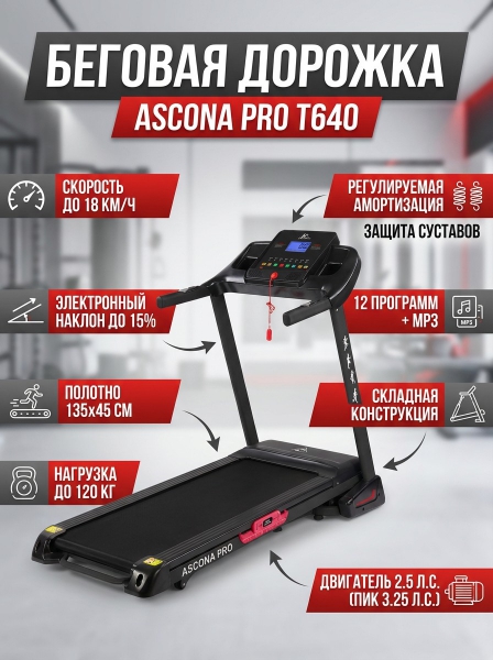 Ascona Pro T640 качественная альтернатива для домашних занятий, если нет времени на посещение спортзала. Подойдёт для спортсменов средней уровни подготовки и для новичков. Суставы и связки будут сохранены благодаря регулировки жесткости полотна, а нагрудный кардиоприёмник поможет наблюдать за частотой сердечных сокращений.