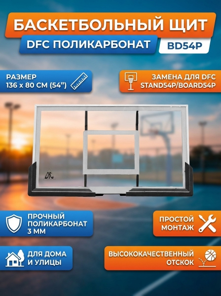 Баскетбольный щит DFC BD54P - ОписаниеСомневаетесь? - Посмотрите рейтинг ТОП-10 по категории «Баскетбольные щиты»Баскетбольный щит DFC без кольца и крепежа BD54P для домашнего использования. Подходит для замены на баскетбольных стойках STAND54P и BOARD54P (не родное крепление: требуется дополнительная подготовка посадочного места).
