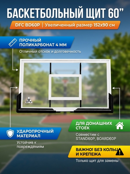 Баскетбольный щит DFC BD60P - ОписаниеСомневаетесь? - Посмотрите рейтинг ТОП-10 по категории «Баскетбольные щиты»Баскетбольный щит DFC без кольца и крепежа BD60P для домашнего использования. Подходит для замены на баскетбольных стойках STAND60P BOARD60P (не родное крепление, требуется дополнительная подготовка посадочного места). Кольцо и крепёж не входят в комплект.