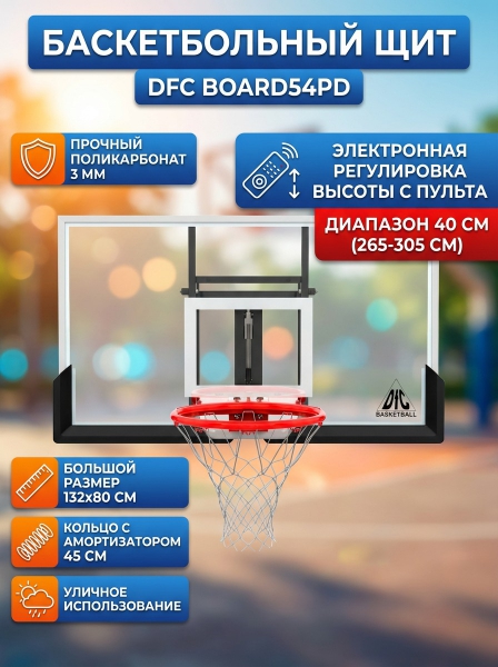 Баскетбольный щит DFC BOARD54PD - ОписаниеСомневаетесь? - Посмотрите рейтинг ТОП-10 по категории «Баскетбольные щиты»Баскетбольный щит с автоматической регулировкой высоты DFC BOARD54PD. Это первая модель с возможностью электронной регулировки высоты. Чтобы изменить уровень, достаточно нажать кнопку на пульте. Высота регулируется в диапазоне 40 см.