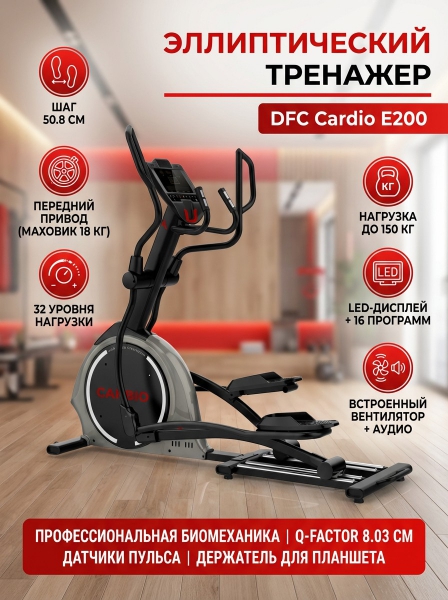 Эллиптический тренажер DFC Cardio E200 - ОписаниеСомневаетесь? - Посмотрите рейтинг ТОП-10 по категории «Домашние эллиптические тренажеры»Эллиптический тренажёр премиум-сегмента для домашнего использования. Достаточно компактный и производительный, позволяет поддерживать мышцы в тонусе, используется для кардио-тренировок. Оснащён магнитной системой нагрузки с электронной регулировкой. Предусмотрено 32 уровня сложности, которые можно подбирать в соответствии с задачами и целями занятия.