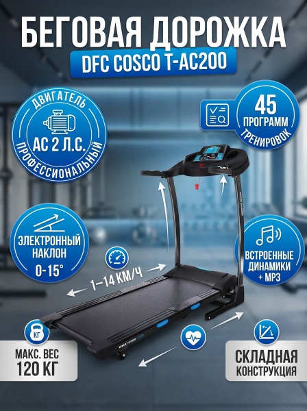 Беговая дорожка DFC COSCO T-AC200 - ОписаниеСомневаетесь? - Посмотрите рейтинг ТОП-10 по категории «Домашние беговые дорожки»Электрическая беговая дорожка DFC COSCO T-AC200 - это идеальный выбор для тех, кто хочет поддерживать себя в форме, не выходя из дома. Благодаря двигателю переменного тока, устанавливаемого исключительно на профессиональных моделях, дорожка не перегревается даже во время длительных тренировок.