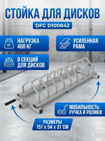 Стойка для хранения дисков DFC D100842 - ОписаниеСомневаетесь? - Посмотрите рейтинг ТОП-10 по категории «Стойки для дисков»Напольная стойка для хранения дисков DFC D100842 – удобный мобильный органайзер для домашнего спортзала. Стойка выдерживает нагрузку до 400 кг, на ней можно хранить до 8 пар дисков любого диаметра. Надежность стойки обеспечивает профиль рамы, выполненный из высокопрочной стали. Удобная ручка и ролики позволяют легко транспортировать стойку. Храните снаряды там, где вам удобно и переносите на время тренировок.