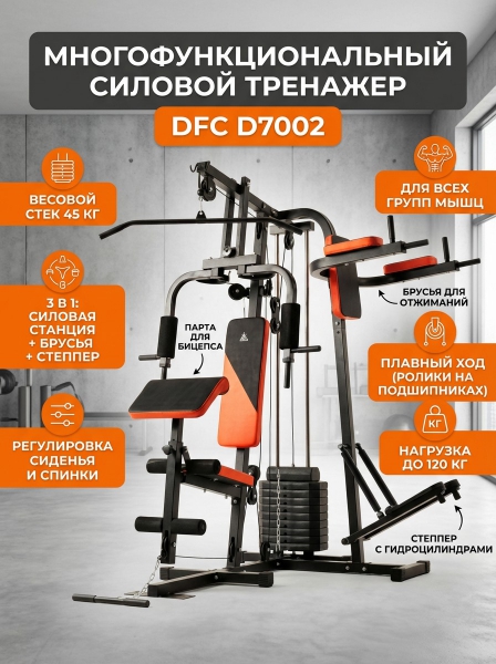 Компания основана в Китае – родине многих организаций, работающих в сфере высоких технологий по производству спортивного оборудования. С 2006 года компания вышла на мировой рынок и получила международный сертификат ISO, подтверждающий безопасность в сфере производства. В ассортименте фирмы вы найдете тренажеры, спортивные аксессуары, массажеры и лимфодренажные аппараты, аспираторы, приборы массажного давления и многое другое. Цель компании – сделать мир лучше и красивее с помощью собственной продукции! Страна бренда: Россия Премиальность бренда:Посмотреть все многофункциональные тренажеры-мультистанции DFC (18) Силовой комплекс, брусья, степпер DFC D7002 - Характеристики