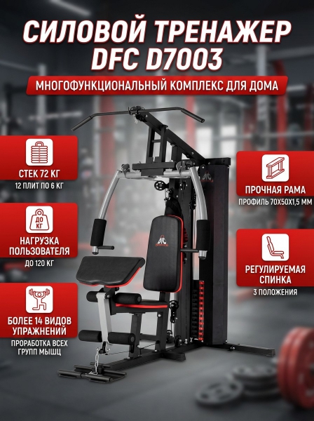 Силовой комплекс DFC D7003 - ОписаниеСиловой комплекс DFC D7003 для домашнего использования. Профиль основной трубы 70 х 50 х 1,5 мм. Стек весом 72 кг, состоящий из 12 пластин в комплекте. Спинка регулируется по горизонтали на 3 уровня. Максимальный вес пользователя до 120 кг.