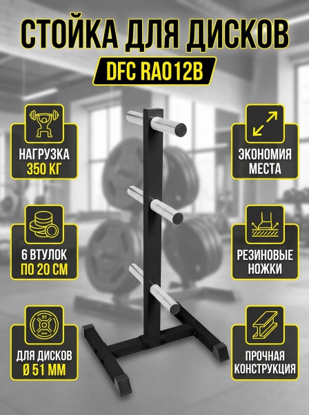 Стойка для хранения дисков DFC RA012B - ОписаниеСтойка для хранения дисков окрашена в черный цвет. Выполнена в профессиональном студийном качестве. Позволяет создать благоприятную психологическую атмосферу во время тренировки - все диски идеально отсортированы. Шесть посадочных мест (втулок) для хранения дисков с посадочным диаметром 50 мм. Длина каждой втулки 20 см. Втулки расположены на высоте 33, 73 и 107 см от пола. Общая нагрузка на стойку не должна превышать 350 кг. Каждая втулка выдерживает не более 60 кг. Резиновые ножки для защиты пола от царапин и устойчивости всей конструкции.