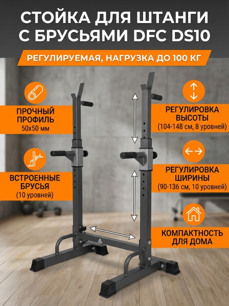 Стойка под штангу с брусьями DFC DS10 - ОписаниеСтойка под штангу с брусьями DFC DS10 для домашнего использования. Профиль основной трубы 50 х 50 х 1,2 мм.