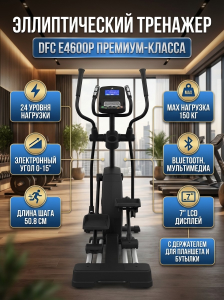 Компания основана в Китае – родине многих организаций, работающих в сфере высоких технологий по производству спортивного оборудования. С 2006 года компания вышла на мировой рынок и получила международный сертификат ISO, подтверждающий безопасность в сфере производства. В ассортименте фирмы вы найдете тренажеры, спортивные аксессуары, массажеры и лимфодренажные аппараты, аспираторы, приборы массажного давления и многое другое. Цель компании – сделать мир лучше и красивее с помощью собственной продукции! Страна бренда: Россия Премиальность бренда:Эллиптический тренажер DFC E4600P - Характеристики