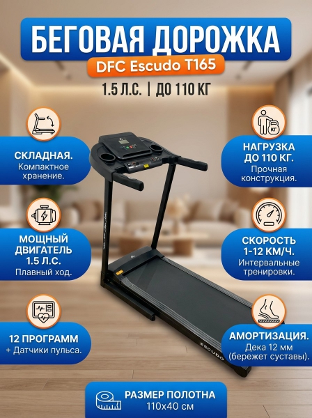 Беговая дорожка DFC Escudo T165 - ОписаниеСомневаетесь? - Посмотрите рейтинг ТОП-10 по категории «Домашние беговые дорожки»Беговая дорожка ESCUDO имеет компактные размеры и увеличенную мощность мотора, отлично подходит для домашнего использования. Мотор мощностью 1.5 лошадиных сил позволяет развивать скорость до 12 километров в час.
