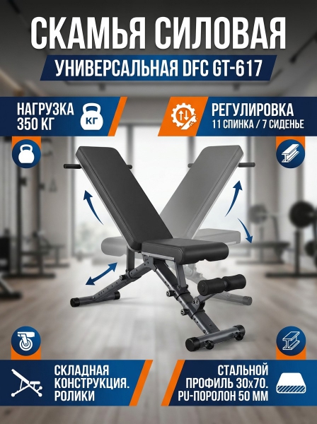 Cкамья силовая универсальная DFC GT-617 - ДоставкаДоставка по Санкт-Петербургу: бесплатно, 2-3 дня Доставка по России: стоимость уточняйте у оператора. Cкамья силовая универсальная DFC GT-617 - Отзывы0.0
