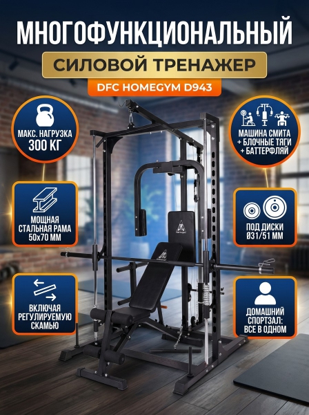 Силовой комплекс со скамьей DFC Homegym D943 - ОписаниеСомневаетесь? - Посмотрите рейтинг ТОП-10 по категории «Силовые тренажеры»Многофункциональный силовой тренажер на базе Машины Смита. Специально разработан, чтобы на небольшой площади предоставить большой выбор упражнений на различные группы мышц.
