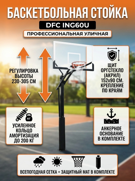 Щит закреплен к столбу не по центру, как обычно, а по бокам. Дополнительно края щита окантованы металлом, а в нижней его части имеется специальное защитное покрытие. Такое решение обеспечивает более высокую стойкость к нагрузкам. Высота стойки регулируется плавно, с помощью удобной ручки. Стандартное значение 305 см можно опустить до 245 см – такая высота будет более комфортной для игры детей. Основное отличие новой стойки от популярной модели ING60 - это отсутствие профиля крепления к столбу по центру щита. Точки крепления на этой модели находятся по краям щита, что повышает надежность конструкции и улучшает внешний вид изделия. Щит из оргстекла полностью прозрачный! Баскетбольная стойка DFC для установки в любом удобном для игры месте под открытым небом: на спортивной площадке, в парке или на даче. Полностью прозрачный щит изготовлен из оргстекла (акрила) толщиной 6 мм. По периметру щит имеет кант из металла. В нижней части щита идет защитное покрытие. Бесступенчатая регулировка высоты с помощью ручки в диапазоне от 245 до 305 см. В комплекте идет защитное покрытие Poly pade на стойке. Усиленное баскетбольное кольцо стандартного размера Ø45 см имеет надежное крепление к щиту. Цвет оранжевый. Всепогодная нейлоновая сетка в комплекте. Основание стойки бетонируется с помощью 4 анкеров (в комплекте), размер ямы под площадку 50х50 см. ВАЖНО! В целях безопасности и во избежание повреждения оборудования запрещается висеть на кольце и других элементах баскетбольной стойки.