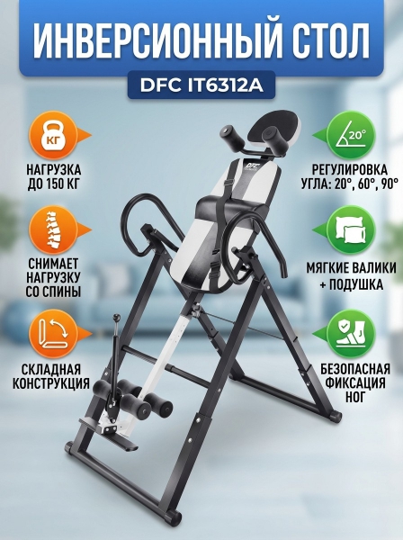 Инверсионный стол DFC IT6312A складной - ОписаниеИнверсионный стол DFC IT6312A — это удобный и эффективный тренажёр для улучшения осанки, укрепления связок и улучшения кровообращения. Он имеет спинку с валиками под голову и съёмную подушку под поясницу для дополнительного комфорта. Страховочный ремень входит в комплект, двойные валики для удобства использования.