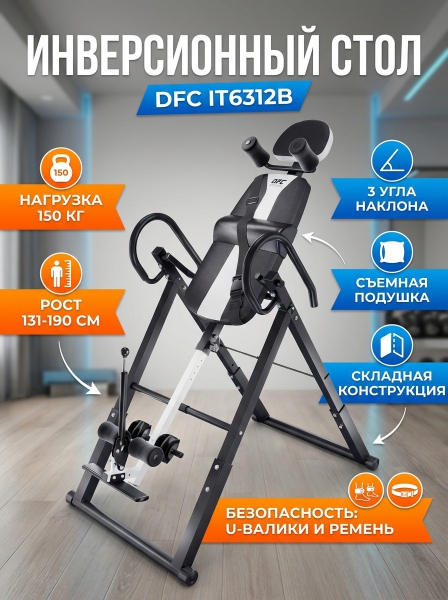 Инверсионный стол DFC IT6312B складной - ОписаниеСомневаетесь? - Посмотрите рейтинг ТОП-10 по категории «Инверсионные столы»Инверсионный стол DFC IT6312B — это удобный и эффективный тренажёр для улучшения осанки, укрепления связок и улучшения кровообращения. Он имеет спинку чёрного цвета с валиками под голову и съёмную подушку под поясницу для дополнительного комфорта. Страховочный ремень входит в комплект, а валики оснащены подпяточниками для удобства использования.