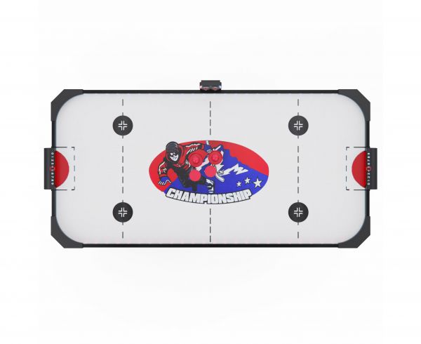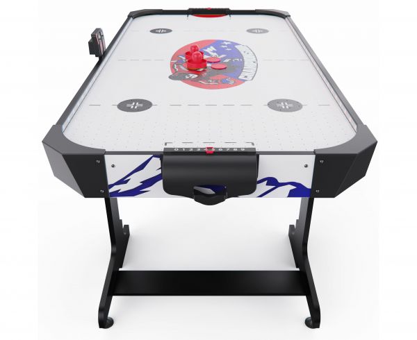 Игровое поле стола выполнено из качественного МДФ с покрытием ПВХ и бумажным слоем, что обеспечивает гладкую поверхность для лёгкого скольжения шайбы и повышает износостойкость конструкции. Толщина поля 3 мм, бортики высотой 25 мм и толщиной 12 мм защищают шайбу от вылета, обеспечивая комфорт и безопасность игры, а высота ножек 71 см делает стол удобным для игроков разного возраста.