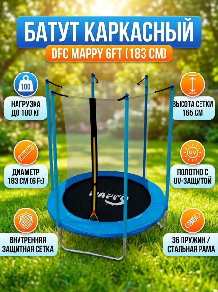 Батут каркасный с сеткой DFC MAPPY 6 ft - ОписаниеСомневаетесь? - Посмотрите рейтинг ТОП-10 по категории «Детские батуты»Каркасный батут с внутренней сеткой DFC MAPPY размером 6 футов станет центром внимания для всех членов семьи и друзей!