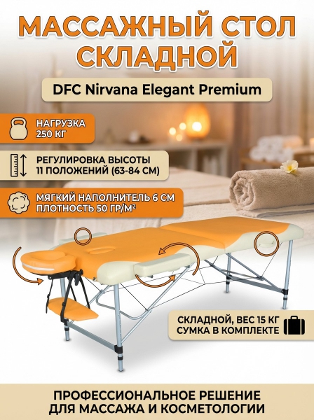 Складной массажный стол DFC Nirvana Elegant Рremium - ОписаниеМассажный стол DFC Nirvana модели Elegant Рremium TS2010_OB2 предназначен для домашнего и профессионального использования. Удобство конструкции позволяет использовать его не только для массажа, но и косметологических процедур (пилинг, обёртывание, талассотерапия и прочие). Стол имеет стильный дизайн и необычное цветовое сочетание: мягкий оранжевый с бежевыми вставками. Такое оборудование впишется в любой интерьер.