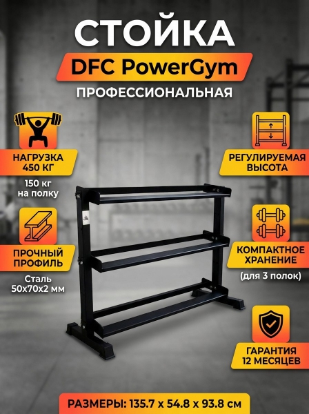 Стойка для хранения гантелей DFC PowerGym RA080 - ОписаниеСтойка для хранения профессиональных гантелей DFC из серии PowerGym RA080 чёрного цвета для домашнего использования. Полки для хранения можно изменить по высоте в зависимости от потребностей пользователя - для этого предусмотрены дополнительные отверстия на стойках.