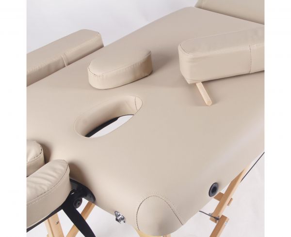 Массажный стол оснащен большой полукруглой фронтальной подлокотной полкой, классическим фронтальным подлокотником, а также двумя съемными боковыми подлокотниками, что повышает комфорт клиента и расширяет возможности использования стола при различных техниках массажа.