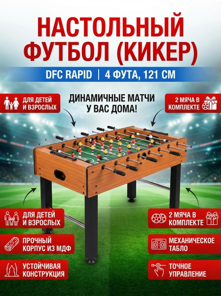 Имеет механические счетчики, позволяющие вести учет забитых мячей. В комплект поставки входят два мяча. Длина стола - 121 сантиметр. Такой размер универсален и подойдет и взрослым, и детям. Фигурки игроков крепятся на надежные металлические штанги, втулки скольжения достаточно прочные, чтобы выдержать напряженный матч. Стол DFC RAPID позиционируется производителем как домашний. Для коммерческих целей лучше подойдут модели, оборудованные монетоприемниками. Игровой стол будет не только отличной покупкой для себя, но и прекрасным подарком. Игра в настольный футбол очень эмоциональная, захватывающая и проходит на больших скоростях. Почувствуйте звуки и атмосферу знаменитой и популярной игры! Настольный футбол является отличным развлечением дома или на даче. Корпус выполнен из специально обработанного МДФ, сверху покрытого прочным пластиком. Стол оборудован механическим табло для подсчета очков.