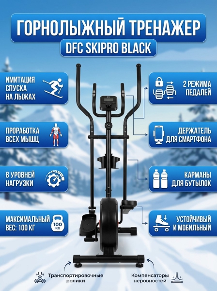 Горнолыжный тренажер DFC SK-3801 - ОписаниеSkiPro Black - это удобный горнолыжный тренажёр DFC серии Skier для занятий лыжным спортом в домашних условиях. Если вы хотите улучшить свои навыки лыжника, увеличить силу и выносливость, то этот тренажёр идеально подойдет для вас. Он позволит вам тренироваться в любое время, не выходя из дома, и подготовиться к зимнему сезону.