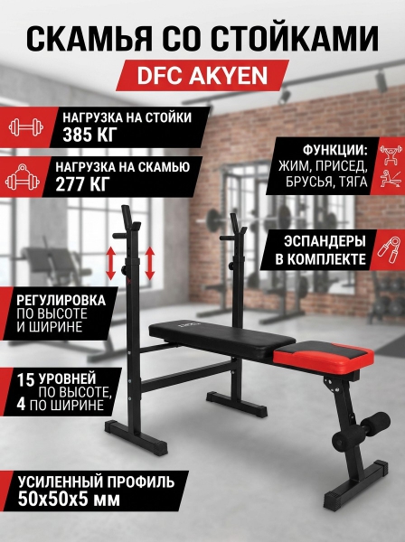 Скамья прямая со стойками под штангу DFC AKYEN