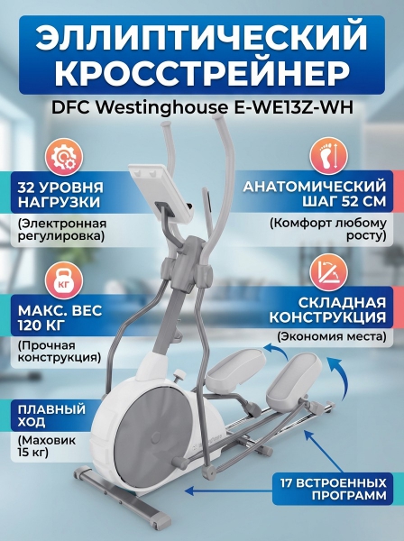 Кросстрейнер DFC Westinghouse E-WE13Z-WH - ОписаниеЭллиптический тренажёр DFC Westinghouse E-WE13Z-WH белого цвета — это мощный и удобный кардио тренажёр, созданный специально для домашнего использования. Он обеспечивает полноценную аэробную нагрузку на все группы мышц без ударной нагрузки на суставы, помогает сжигать калории, развивать выносливость и улучшать сердечно-сосудистую систему. Модель способна выдержать пользователя весом до 120 кг. Тренажёр оснащён электромагнитной системой нагрузки, которая обеспечивает максимально точную и бесшумную регулировку сопротивления. Электронная регулировка сопротивления с 32 уровнями позволяет точно настраивать интенсивность тренировки, а увеличенный инерционный вес маховика 15 кг способствует плавной и стабильной работе тренажёра, создавая комфортные условия для длительных и эффективных тренировок. Нескользящие педали обеспечивают отличное сцепление даже при интенсивных занятиях. Они просторные, устойчивые и предотвращают проскальзывание стоп, обеспечивая дополнительную безопасность. Длина шага составляет 52 см, что позволяет комфортно тренироваться как высоким, так и невысоким пользователям, делая движение естественным и эффективным. Все данные отображаются на LCD-дисплее, где вы можете отслеживать ключевые параметры: время, дистанцию, калории, скорость, пульс, мощность и темп. Для удобного отслеживания за состоянием организма во время тренировки на поручнях установлены сенсорные датчики пульса. Одним из ключевых преимуществ тренажёра является его складная конструкция. Это особенно удобно для использования в квартирах или небольших помещениях. Такой компактный эллиптический тренажёр впишется даже в ограниченное пространство. Для удобного перемещения предусмотрены транспортировочные ролики, а компенсаторы пола позволяют установить тренажёр ровно даже на неровной поверхности. Эллиптический тренажёр DFC Westinghouse E-WE13Z-WH — это оптимальное сочетание надёжности, комфорта и функциональности. Тренажёр продуман до мелочей: есть держатель для бутылки, чтобы вода всегда была под рукой, и держатель.