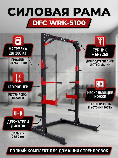 Силовая рама DFC WRK-5100 - ОписаниеСомневаетесь? - Посмотрите рейтинг ТОП-10 по категории «Силовые рамы»Силовая рама, стойка для штанги с подстраховкой DFC WRK-5100 – многофункциональный тренажёр для домашних тренировок. Серия тренажеров WELCOME выполнена в современном дизайне, где яркий красный цвет гармонично сочетается с элегантным черным. Продуманная геометрия и контрастное цветовое решение позволят тренажеру гармонично вписаться в любую комнату и стать ярким акцентом вашего интерьера. Это идеальное решение для тех, кто ценит функциональность и эстетику в каждой детали своего дома.